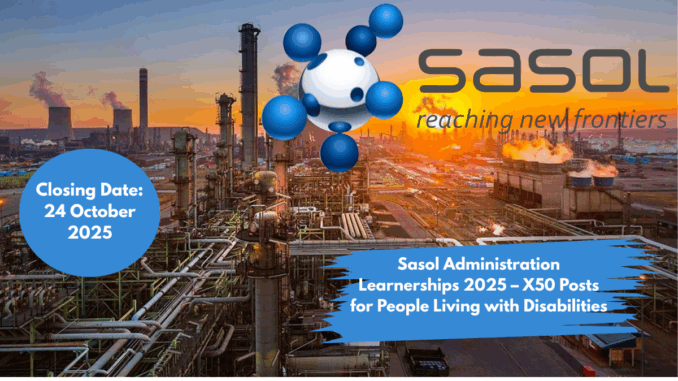 Apply for the Sasol Administration Learnership Programme 2025. Open to South African unemployed youth living with disabilities in Sandton, Sasolburg, and Secunda. 50 positions available. Gain admin skills, mentorship, and an NQF-aligned certificate. Closing Date: 24 October 2025.